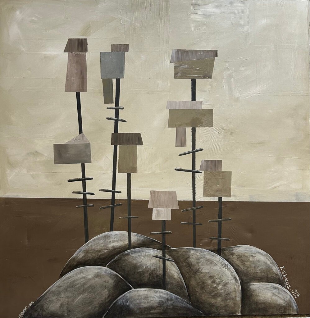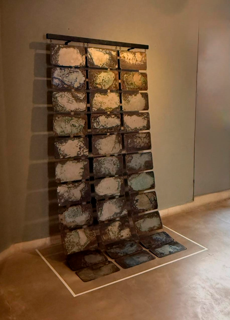 Mientras Asar utiliza su formación arquitectónica para crear estructuras que remiten a saberes ancestrales y espacios habitables como refugio y permanencia, Garzón Duarte interviene la rigidez del metal para trazar cartografías que parecen desafiar la gravedad.