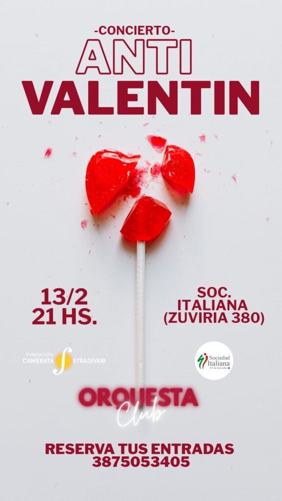 Este viernes, a partir de las 21, la Orquesta Club dará el «Concierto anti San Valentín», en la Sociedad Italiana, Zuviría 389. Cantarán y tocarán temas de desamor porque «cantar lo que duele también libera», dicen desde la organización de la presentación de los jóvenes artistas. Las entradas a un costo de $10.000 pueden reservarse en el 3875053405, y también pueden adquirirse en la secretaría de la institución de Zuviría 3989.
