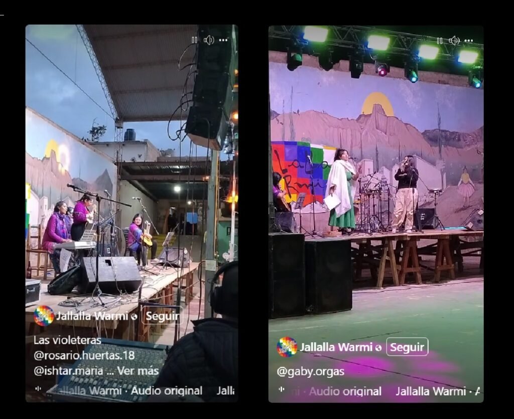 Con respecto al Jallalla Warmi, es un encuentro que ya está cumpliendo este año 10 años. Son 10 años de querer sacar la voz y decir, bueno, somos mujeres que queremos ser reconocidas en los escenarios, demostrar nuestra actividad, nuestra capacidad y poder participar de eventos tan importantes como lo que es en Tilcara el Enero Tilcareño, un mes de actividades culturales, y que por ahí no nos convocaban en muchos años al festival mismo, al Enero Tilcareño. Y eso por darte un caso local, y ni hablar de todos los festivales que existen alrededor de todo el país y cada pueblo. Estoy segura de que también existen mujeres músicas, mujeres artistas que también desearían subir al escenario. Jallalla Warmi pasó a ser eso porque partió de nuestra propia inquietud, entonces salíamos con Cristina Paredes y copleras y sikuris al escenario y queríamos decir este es nuestro espectáculo musical, esto es lo que queremos hacer. Y después con los años empezamos a abrir la invitación para que otras también se sumaran, lo hicimos a través de redes sociales y la convocatoria fue increíble. Hemos tenido eventos que duraban tres días, con escenario y música, una cosa increíble. Y ahora vienen artistas de otras provincias y hasta de otros países, de Perú, de Chile, de Ecuador. Pasó a ser un festival internacional de nacional, porque vienen artistas de todas partes y algunas muy reconocidas. En este año, por los 10 años, hubo 122 propuestas artísticas, de las cuales había entre músicas, agrupaciones de danza solo femeninas, artistas visuales y performance hasta de teatro. Había de todo, pero si bien nuestro festival más se conoce por la música, las artistas visuales también tuvieron su espacio, la danza también para poder expresarse en un programa de tres días también, viernes, sábado y domingo. El viernes fue de artes visuales y performance, el lanzamiento de las muestras colectivas que hubo en el Museo Nacional Terry. Luego el sábado fue el concierto en el Capec (Centro Andino Para la Educación y la Cultura) que se hizo de música, y también sobre la performance en teatro. Luego el domingo fue la apertura con música y danza desde las 11 de la mañana hasta las 11 de la noche, 12 horas de manifestaciones musicales que fueron realmente increíbles. Hemos trabajado duro, un montón, recibiendo a las artistas, dándoles meriendas, desayunos, almuerzos, cenas. Es una movida tremenda. Estamos muy felices por haberlo logrado, porque con esto estamos demostrando muchas ganas las mujeres por participar, por interpretar, por mostrar nuestro arte en el escenario.