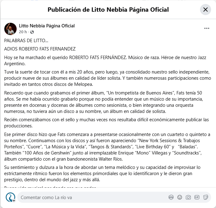 Las redes sociales se inundaron de mensajes de despedida por parte de músicos, periodistas y seguidores que destacaron su integridad artística. Sus restos serán despedidos en una ceremonia privada, pero su legado resonará por siempre en cada club de jazz donde una trompeta intente alcanzar esa sensibilidad única que él poseía. La música argentina ha perdido a uno de sus sopladores más brillantes y emotivos de la historia.