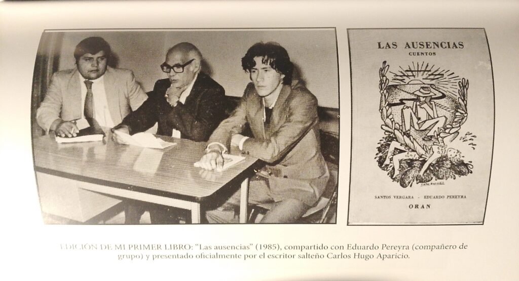 Surgió este recuerdo porque las redes que nos conforman se tejen de esos encuentros –retomo la primera persona-, y hojeando el libro que me regala, veo una fotografía del 85, con un joven Santos Vergara compartiendo la mesa de la presentación de su primer libro, Ausencias, con el escritor y poeta nacido en La Quiaca y que de muy changuito se afincó en la ciudad de Salta.