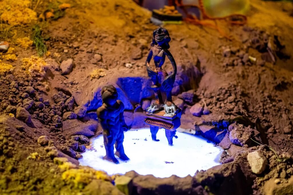 En el piso, un cauce seco de tierra y arena local atraviesa la sala, y en su centro se despliegan figuras de apariencia onírica que combinan platillos voladores, objetos cotidianos y presencias surgidas de los relatos recopilados en el territorio. La instalación convierte así el museo en un espacio de resonancia y aparición, donde el paisaje real y el imaginado se entrelazan.
